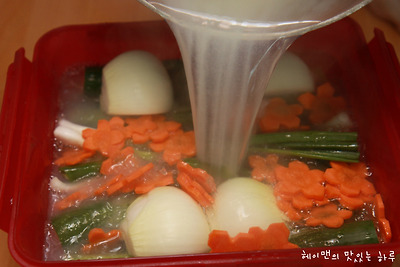 물20컵에 천일염 1컵, 청주 1컵을 넣고
