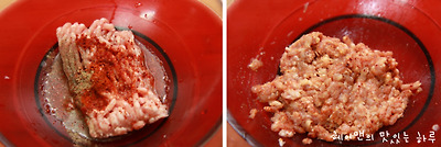 돼지고기다짐육 100g(양념 : 고추가루 1T, 청주 1T, 소금한꼬집, 후추가루)