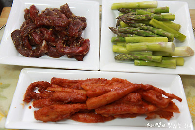 산적용 소고기, 더덕무침, 아스파라거스