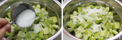 깍둑썰기한 차요테에 소금 반컵을 넣고
