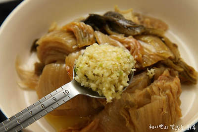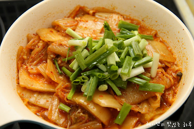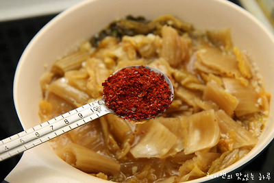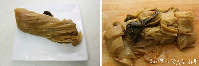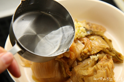 묵은지는 양념을 털어내고 물에 한번 씻어서 물기를 꼭 짜준 후