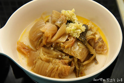 팬에 묵은지를 담고 들기름과 다진마늘을 넣어주세요