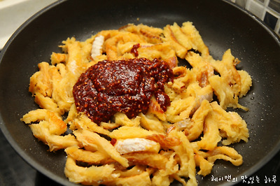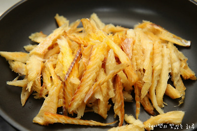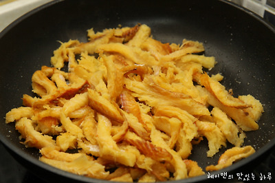 팬에 들기름을 두르고 황태채를 볶아주세요