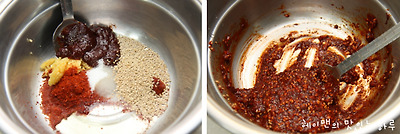 고추장 1.5T, 설탕 1T, 고추가루 1T, 물엿 1T, 소금1t, 통깨 1T, 참기름 1T
