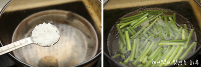 끓는물에 소금을 넣고 마늘쫑을 데쳐주세요