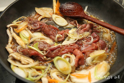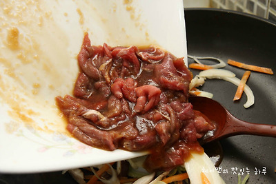 양념한 불고기를 넣고 볶아주세요