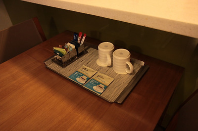 식탁위에 커피와 차등이 준비되어 있습니다.