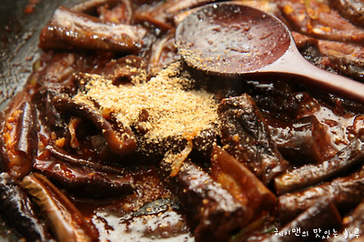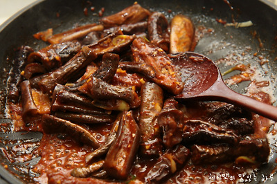 볶은 가지에 양념장을 넣고 볶아주세요