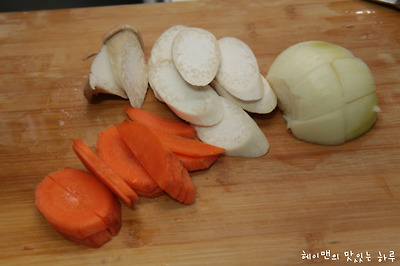 양파와 버섯, 소세지를 넣고 볶아주세요~