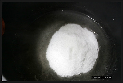 2. 한천이 다 녹았으면 설탕을 넣고 약불로 설탕이 다 녹을때까지 끓여주세요~