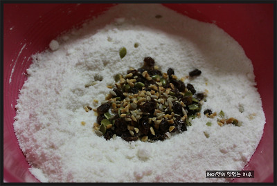 4. 물에 불려 두었던 견과류와 건포도를 넣어서 섞어주세요~