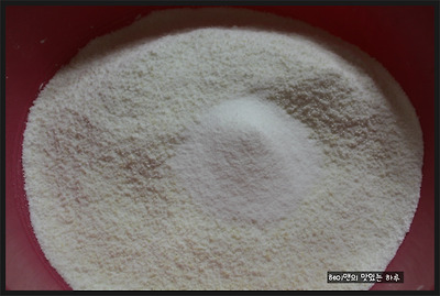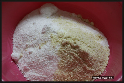 (설탕을 골고루 섞어주신 후 절편 만들 쌀가루를 반컵정도 덜어주세요~)