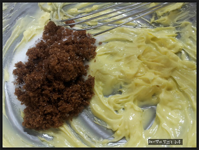 1. 실온에 놔둔 버터를 부드럽게 휘핑한후 설탕과 흑설탕, 소금한꼬집을 넣고 휘핑해 주세요~