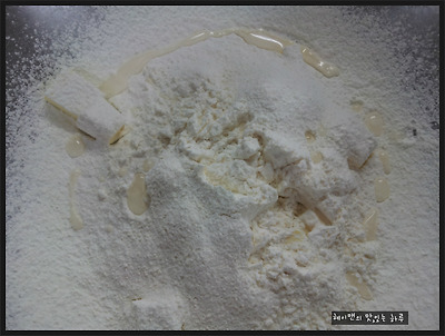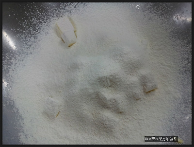 3. 버터를 밀가루로 감싸서 으깨어 주어 고슬고슬한 상태로 만들어 주세요~