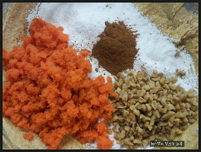 버터 70g, 흑설탕 120g, 계란 3개, 박력분 150g, 베이킹파우더 1ts, 계피가루 1.5ts, 호두 70g, 당근 220g