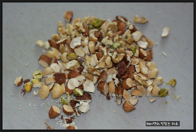 5. 하루한봉 견과류를 두봉지 꺼내서 칼로 다져서 준비해 주었어요~ ㅎ