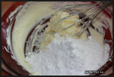 1. 실온에 놔둔 버터는 크림화르 시킨 후 슈가파우더를 넣고 휘핑해 주세요~