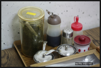 테이블 한쪽에 막국수 양념통과 만두국에 넣을 김가루가 준비되어 있네요~ ^^