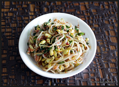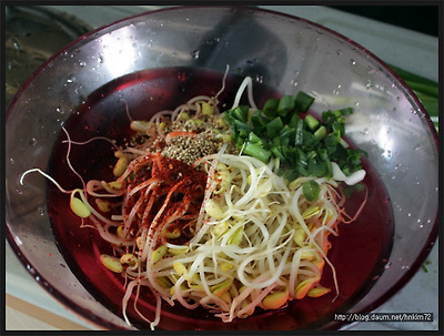 볼에 담고 고추가루, 파, 소금, 깨소금을 넣고 무치니