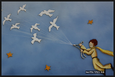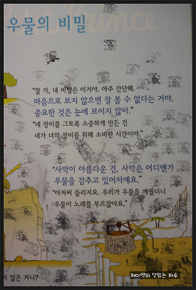 건물 한곳에 들어서면 어린왕자 책에 대하여 벽면에 많은 글들이 있는데~