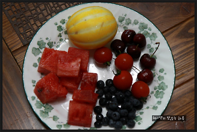 참외 1개, 수박, 방울토마토, 체리, 블루베리, 오미자 효소, 얼음