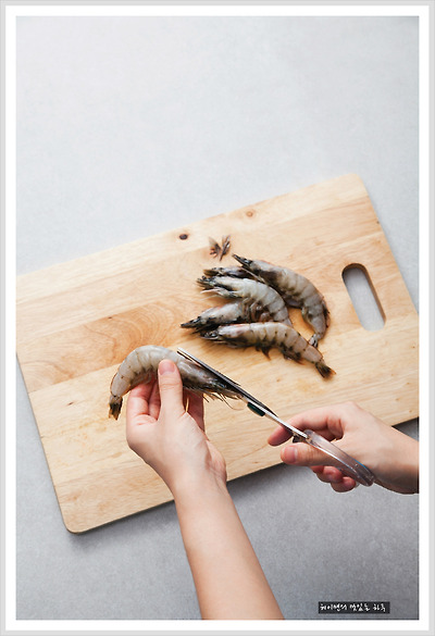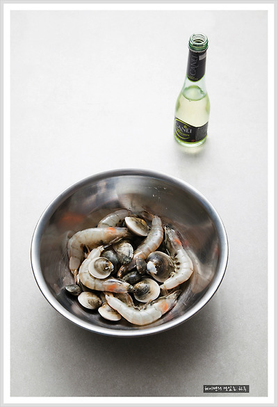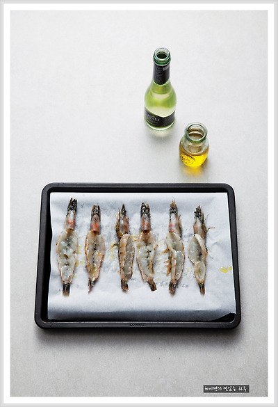 새우는 머리뿔을 제거하고 와인과 올리브유를 뿌려주세요~