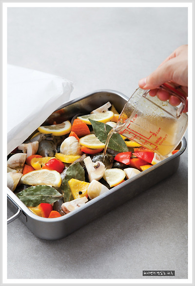 채소스톡을 넣어준 후 종이호일을 덮고 오븐에 구워주시면 됩니다.