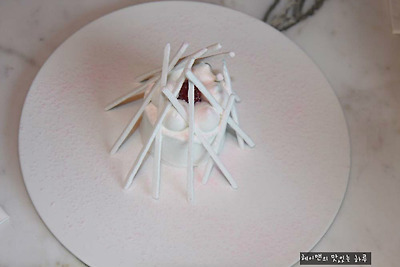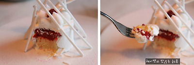 라즈베리 소르베, 바닐라 아이스크림, 머랭, 산틸리크림, 머랭파우더로 만들어 졌어요~