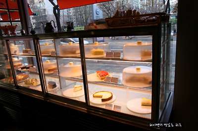 케익진열장엔 다양한 케익들이 진열되어 있고
