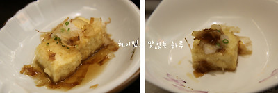 녹말가루 입혀 튀긴 두부에 가쓰오부시 양념장과 가쓰오부시랑 무즙이 올려서 나옵니다.