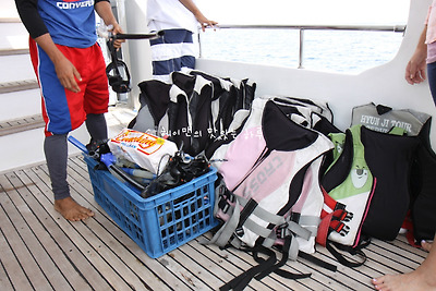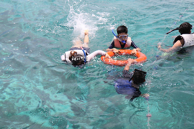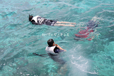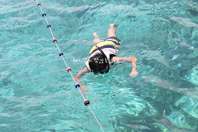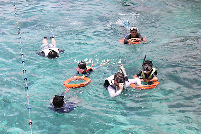 구명조끼와 스노쿨링 장비 착용을 하고