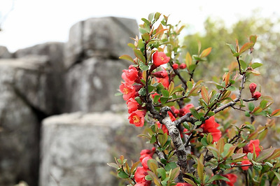 입석대 뒤로 명자꽃이 피어났군요.
