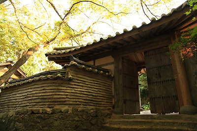 입구부터 고택의 촘촘한 담장의 무늬와 동근 돌계단을 가로막고 하늘을 가린 거대한 나무 두 그루가