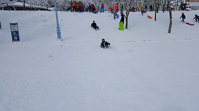 잔디가 수북히 쌓인 언덕위에서부터 운동장까지 비탈진 곳에 새로 생긴 눈썰매장.