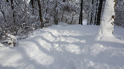 누군가 이곳에서 눈썰매를 탄 흔적이 있다.