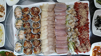 엄청나게 큰 피조개 14개, 수육과 홍어가 12개, 산낙지 한 마리, 육회가 가득 담긴 대형 접시가 들어왔습니다.