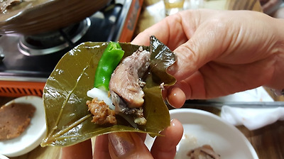 ▲황칠나무 잎에 오리고기를 담고 양파와 고추에 된장을 듬뿍 발라 먹으면 진미다.