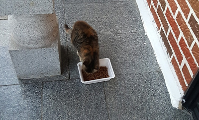 첫날 이 꼬마 녀석의 사료를 탐낸 다른 길냥이가 와 한바탕 으르렁 댔고 밖에서 싸우는 소리도 들렸지만,