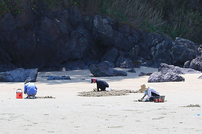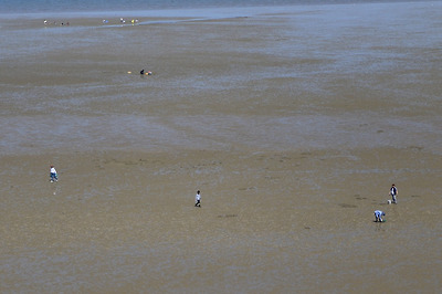 많은 사람이 바닷가에서 무엇인가 채취하고 있다.
