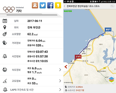 2코스를 직선으로 와 고사포 해수욕장 명인 바지락에서 끝냈더니 총 거리는 약 6.04km정도 되었다.