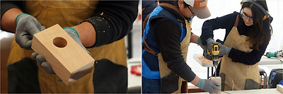 아직은 서툴지만 선생님이 나무를 잡아주고 같이 거들어 수월하게 구멍을 뚫는다.
