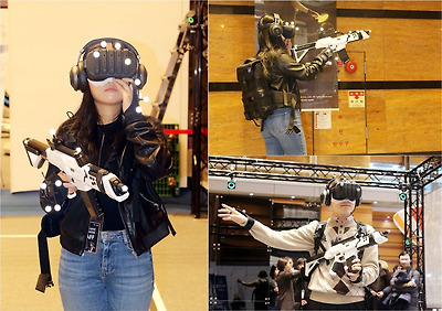 (주)스코넥엔터테인먼트의 VR 게임인 '모탈 블리츠 VR 포 워킹 어트랙션'은 직접 게임 속에 들어가서 움직이며 총을 쏘는 게임인데요, 오큘러스 리프트가 연결된 PC를 등에 메고 센서가 부착된 장갑을 착용한 다음 HMD와 헤드셋을 쓰고 컨트롤러 역할을 하는 머신 건을 들고 시작합니다.