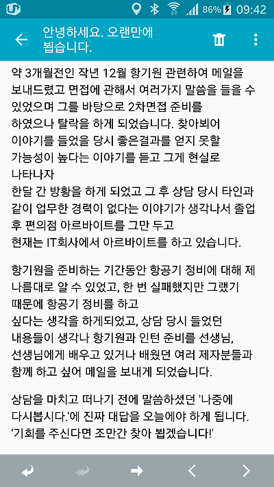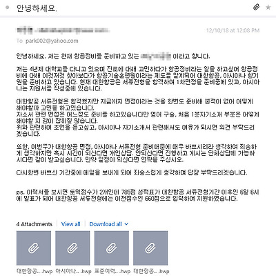 지난 3월, 한 청년이 보냈던 메일이 있습니다. 작년 12월, 항기원 채용과정이 한창 진행되고 있던 시기에 저를 만났고, 합격하지 못할 것이라는 말을 듣고, 실제로 면접에서 탈락하자 잠시 방황하다가 다시 찾아오겠다는 내용이었습니다. 그래서 지난 메일함을 찾아보니 청년이 보낸 메일이 있더군요. 워낙 많은 메일을 받고 있기 때문에 기억하기는 어려웠지만, 실제 만나보니 조금 기억이 있는 얼굴이었습니다.
