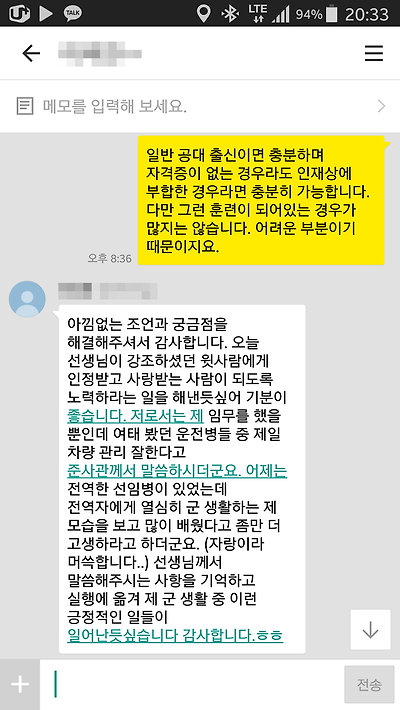 나이는 어리지만 문자로 나누었던 작은 가르침에도 적극적으로 실천하며 노력하는 경우가 있는 반면, 아무리 강조하고 자신의 고집대로 스펙에 집중하는 경우도 있습니다. 시간이 지나면 진실을 알게 되겠지만, 이미 기회를 놓이게 되는 경우가 많아 아쉬운 마음이 드는 사례가 많습니다. 지금 자신에게 필요한 것은 하기 싫은 것들이나 먹기 싫은 것들이라는 사실을 아셔야합니다. 내게 무엇이 필요한지 진지한 고민을 해보시기 바랍니다.