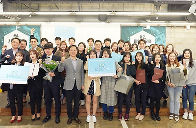 <청춘, 내:일을 그리다 2기 참가팀 및 기아차, 그린카, 열매나눔재단 담당자들이 기념촬영을 하고 있다>