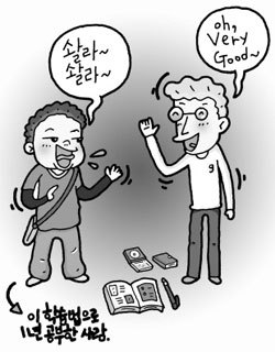 수업이 끝난 뒤 하루 5시간의 학습시간을 정해놓고, 4시간은 예문 정리 및 말하기에 필요한 문법 정리, 영작, 그리고 나머지 1시간은 이를 암기하기 위해 우리말을 듣고 영어로 말하는 방식으로 매일 큰 소리로 외치며 연습을 했다. 그렇게 3개월을 보내고 있던 어느 날, 술집에서 우연히 일본인 친구를 만났다.