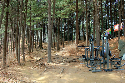 운동기구가 있는 소나무 숲을 지나..
