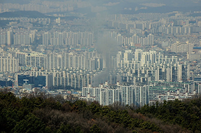 멀리 소방차의 사이렌이 울리는가 싶더니 아파트에서 연기가 오른다.