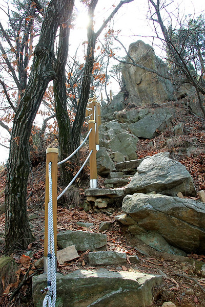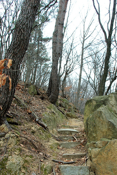 지능선 산길에서 작은 계단이 있는 경사를 치오르고..