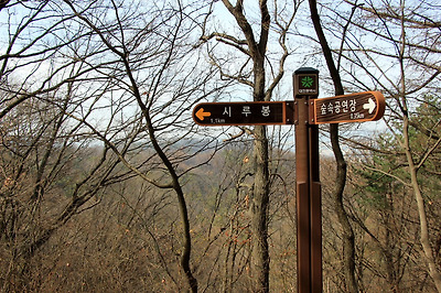 정상으로 가는 길과 숲속공연장에서 올라오는 이정표를 처음으로 마주한다.